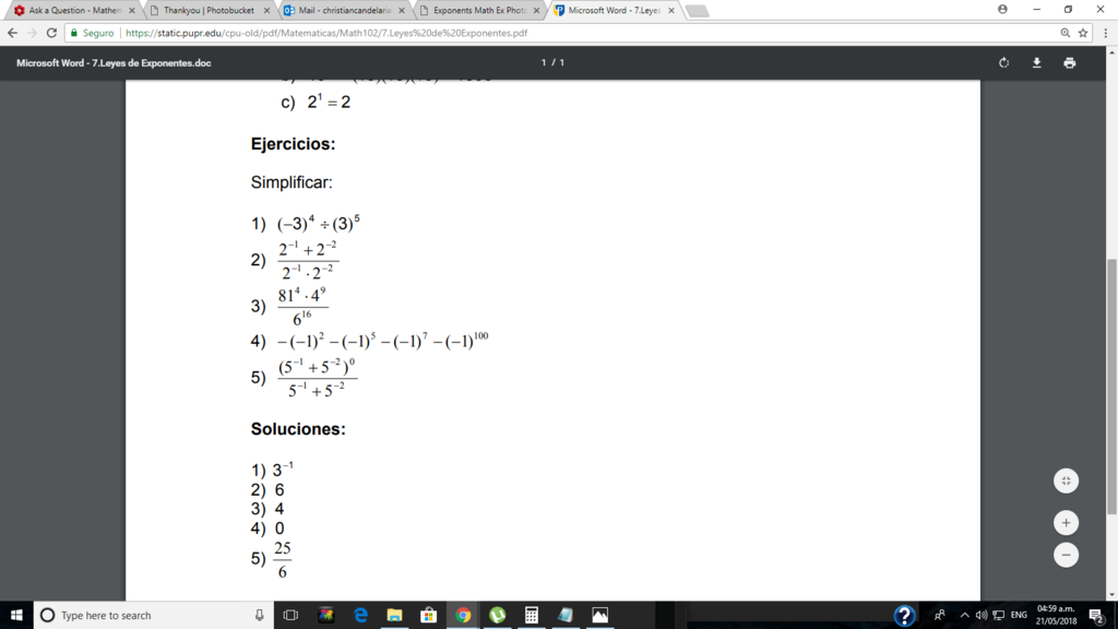In this document, I have 5 exercises involving exponents and their five corresponding solutions. I am trying to find out why these are the solutions for these equations, as I cannot seem to get the same results as the provided solutions. The exercises ask to simplify the following equations. Can anyone assist in explaining how to solve for these five equations?