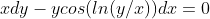 $$d/dy(-ycos(ln(y/x))=-cos(ln(y/x))+sin(ln(y/x))$$ $$d/dx(x)=1$$ So, I should find integrating factor with solving this: