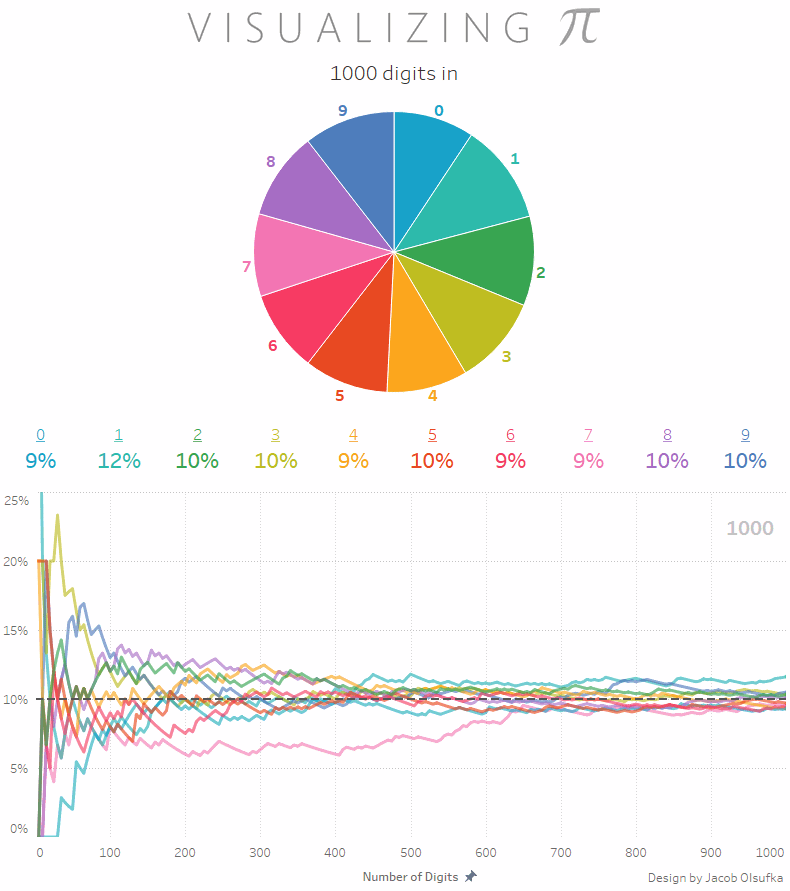 "Does π's fixed pattern of digits appear as a random stream?" Generally speaking, I would have to say, "Yes." However, depending upon which particular decimal place of π that we stop to add up each of its ten digits1, we may find some peculiarities leading the average person to wonder if this is true.